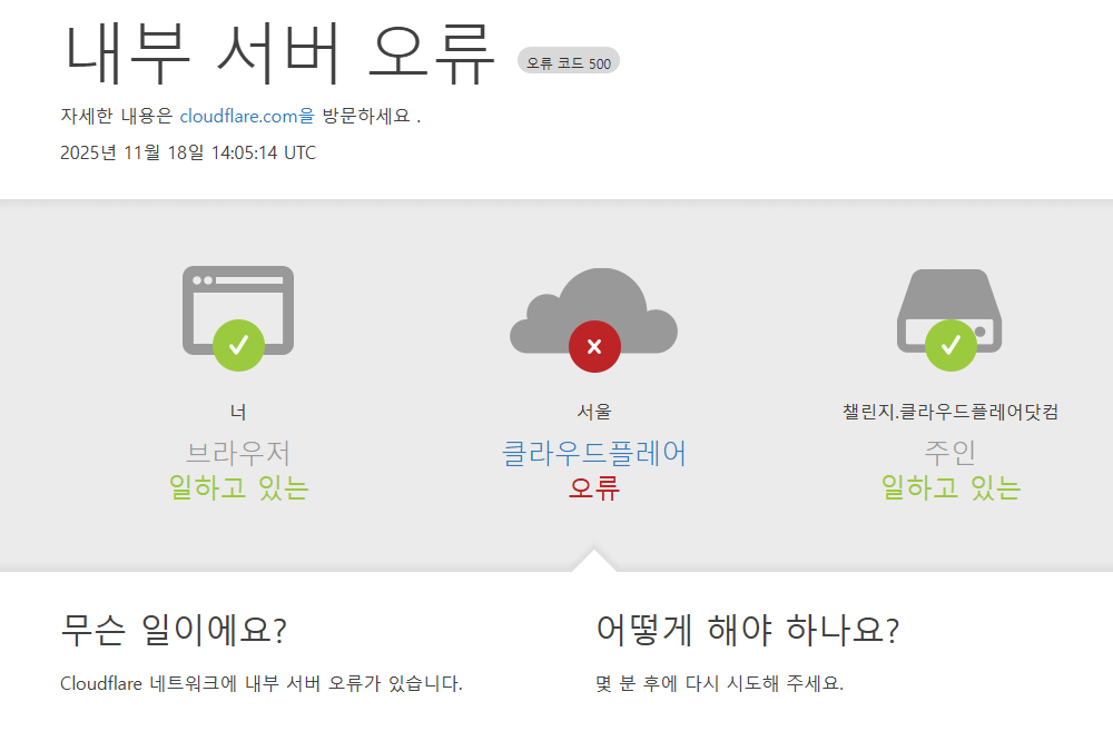 원인이 클라우드플레이 글로벌 네트워크망 오류로 인해 생긴 오류라고 합니다.